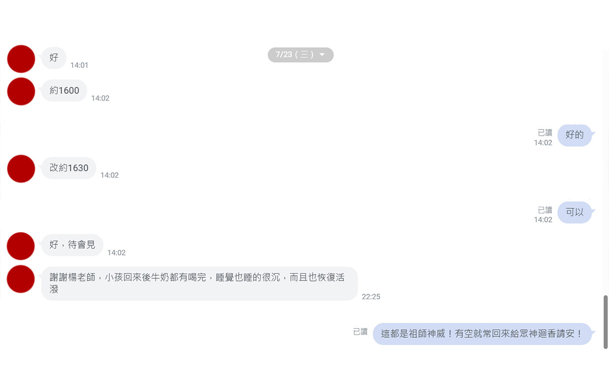 他們已經帶孩子去看過醫生,在官方line中向老師求助,是否可以帶小朋友回總道院收驚退煞。